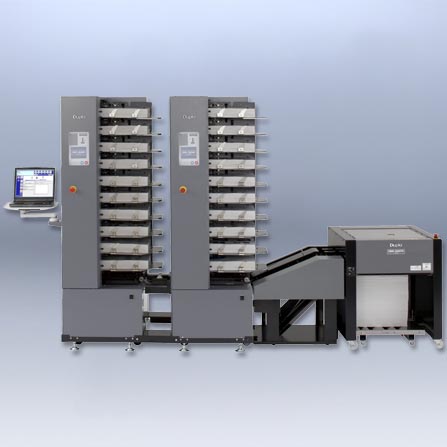 The 10-bin DFC-101 is a compact and easy to use collator. Equipped with three feed rollers and adjustable paper separators, the DFC-101 provides reliable and consistent feeding of a wide variety of fine quality, uncoated papers up to 128 gsm. Double feed and mis-feed detections help ensure the accuracy of the collated set. Collated sets are delivered to the integrated stacker and can be straight or offset stacked. The integrated stacker holds up to 3.15”